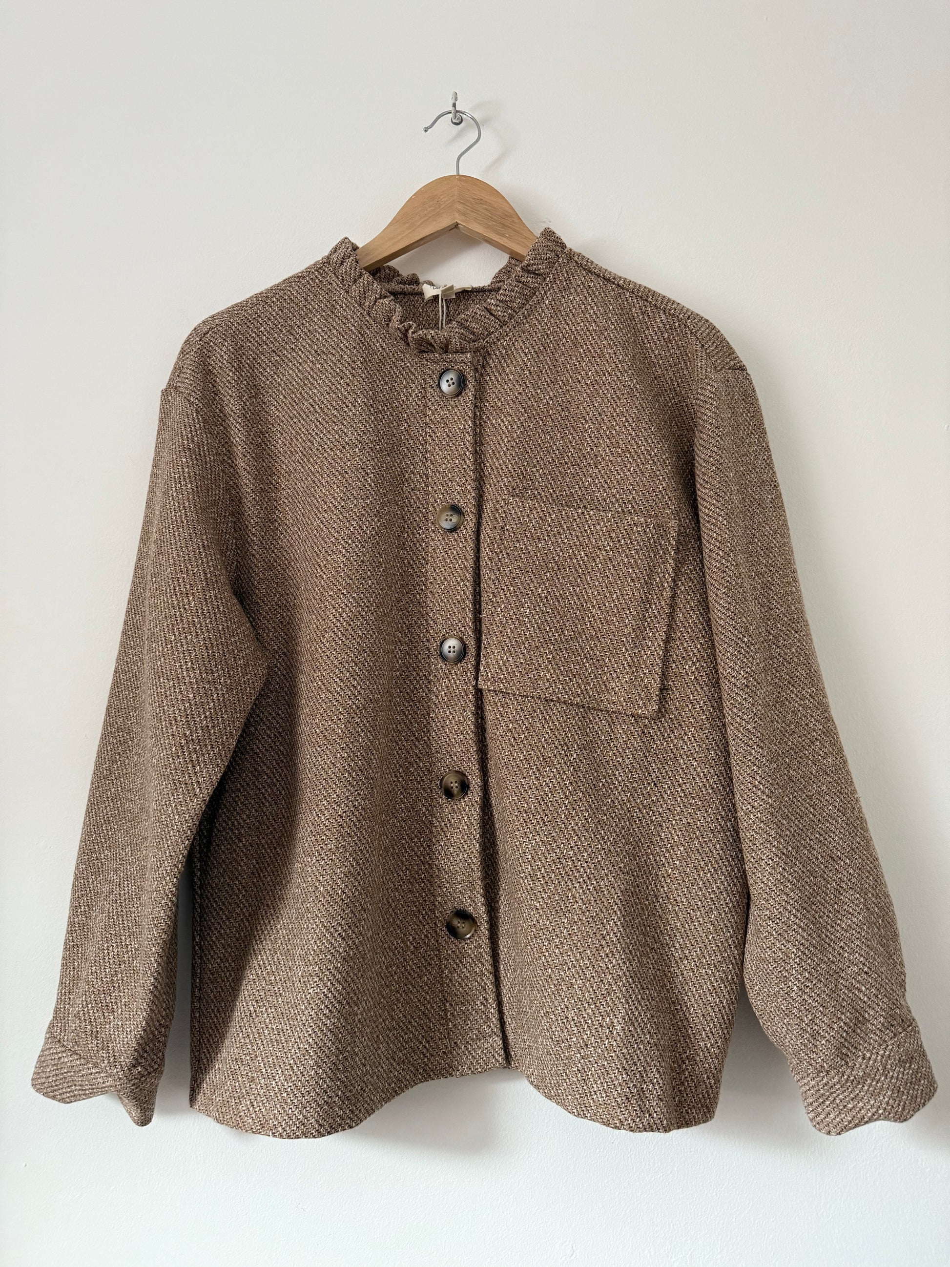 Veste chemise sans col avec boutons de couleur taupe mouchetée crème